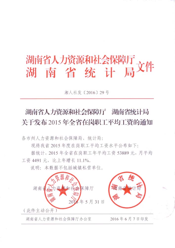 湖南省人力資源和社會(huì)保障廳,湖南省統(tǒng)計(jì)局關(guān)于發(fā)布2015年全省在崗職工平均工資的通知